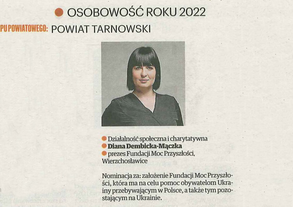 Diana Dembicka-Mączka w plebiscycie Gazety Krakowskiej 2022 roku otrzymała tytuł „Osobowością Roku 2022” za działalność społeczną i charytatywną. Diana Dembicka-Mączka jest lekarzem stomatologiem, a także prezesem Fundacji Moc Przyszłości, która od początku inwazji Rosji na Ukrainę organizuję pomoc humanitarną na rzecz pomocy obywatelom Ukrainy.
